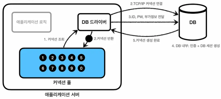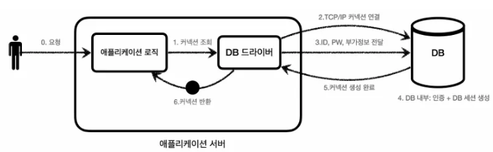 - DB 드라이버는 DB와 TCP/IP 커넥션을 연결한다. 물론 이 과정에서 3 way handshake 같은 을 위한 네트워크 동작이 발생한다