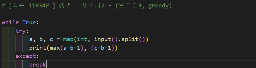 (1) a, b, c 정수 입력받고 a-b , c-b중에서 더 큰 값을 출력한다.