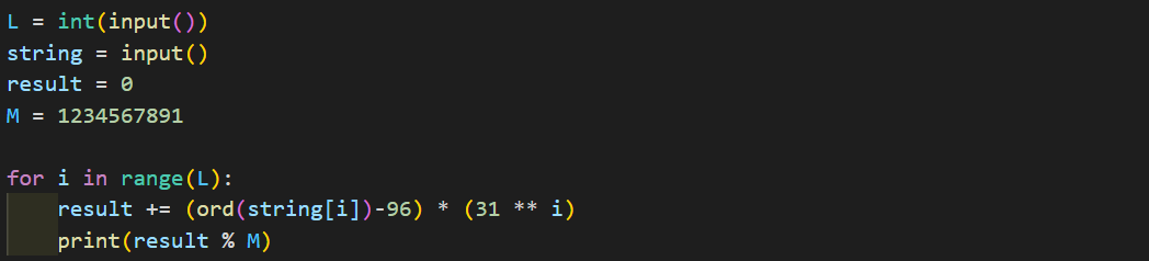 첫 줄에는 문자열의 길이 L이 들어온다. 둘째 줄에는 영문 소문자로만 이루어진 문자열이 들어온다.