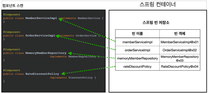 - AppConfig에서 @Bean으로 직접 설정 정보를 작성했고, 의존관계도 직접 명시했다. 이제 설정 정보 자체가 없어 의존관계 주입도 클래스 안에서 해결해야함.
