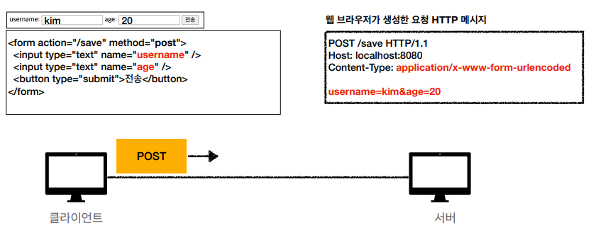 - form의 내용을 메시지 바디를 통해 전송(key=value, 쿼리 피라미터 형식)