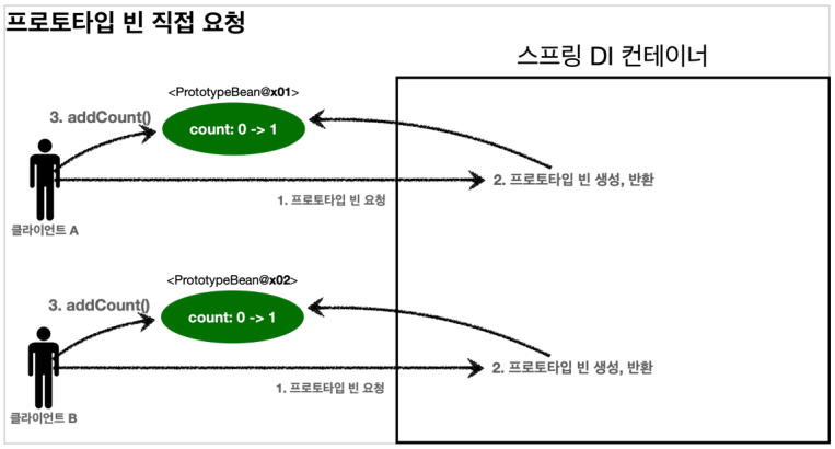 - 1. 클라이언트B는 스프링 컨테이너에 프로토타입 빈을 요청한다.