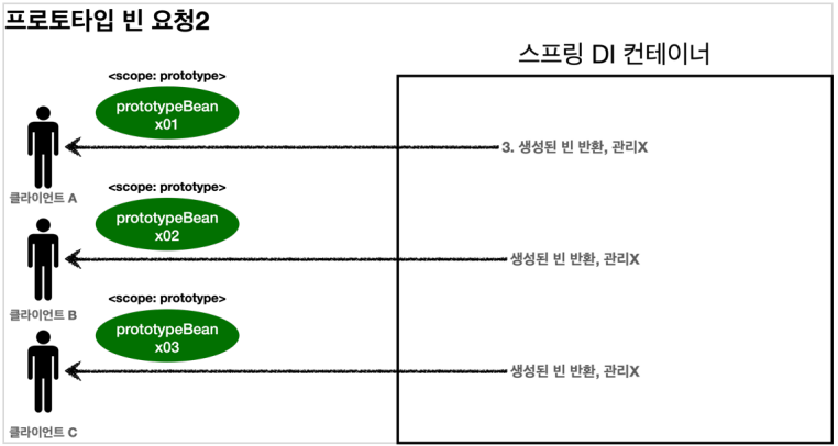 - 3. 스프링 컨테이너는 생성한 프로토타입 빈을 클라이언트에 반환한다.