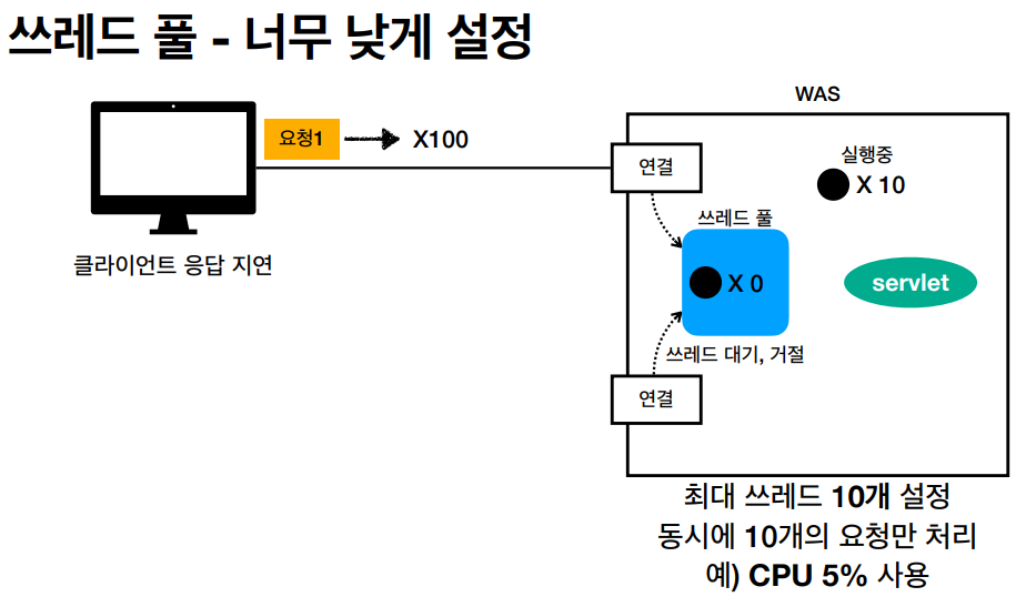 - 값을 너무 낮게 설정하면 -> 동시 요청이 많으면, 서버 리소스는 여유롭지만, 클라이언트는 금방 응답 지연