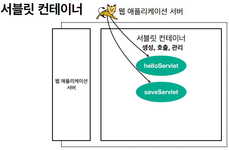 - 톰캣처럼 서블릿을 지원하는 WAS를 서블릿 컨테이너라고 함