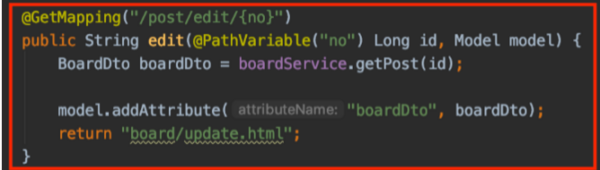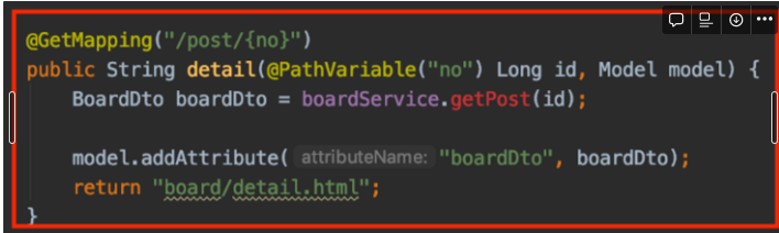 @PathVariable을 통해 요청에 오는 id값을 받아 getPost로 전달. getPost는 각 게시글의 정보를 가져오는 기능인데 Service에서 구현해줄 것이다. model.을 통해 boardDto 타입의 데이터를 view에 전달