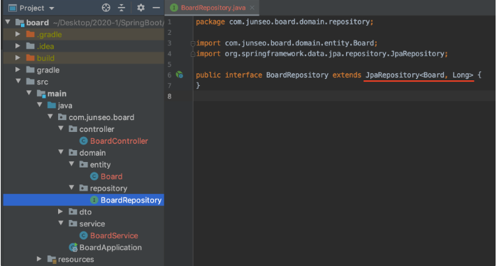 Repository는 데이터 조작을 담당. interface로 생성하며, JpaRepository를 extends한다.