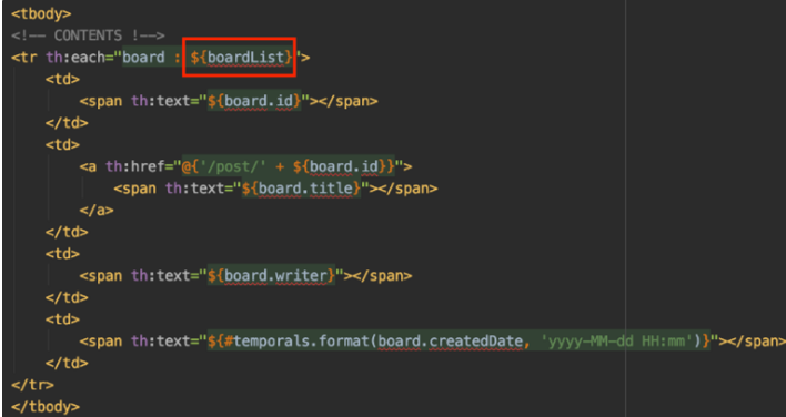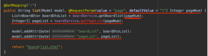 list.html에서는 boardList라는 것을 정보로 출력. 따라서, Controller에서 boradList를 넘겨줘야 DB에 저장된 데이터를 볼 수 있음.