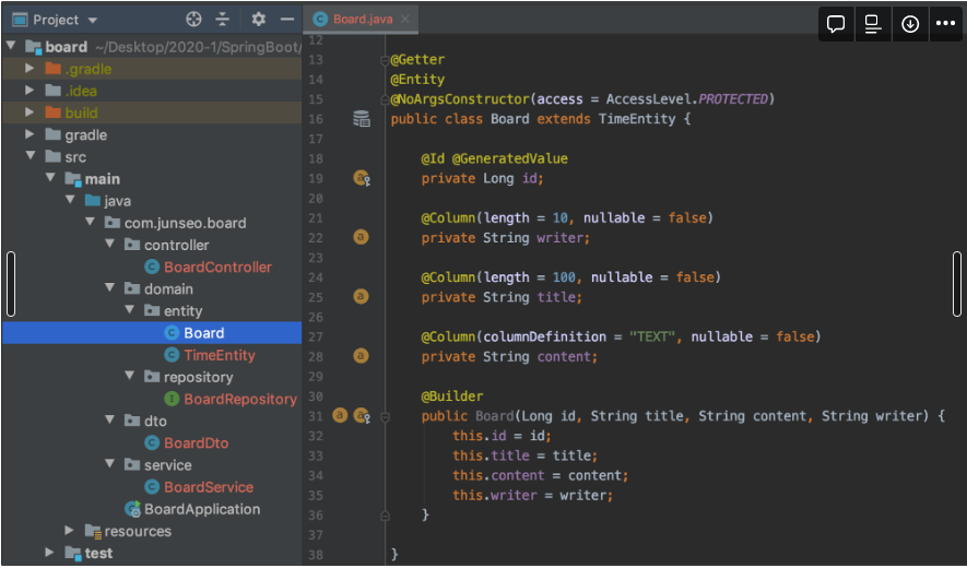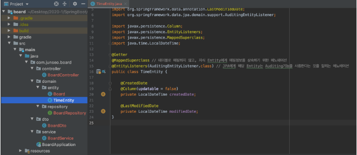 extends하고 있는 TimeEntity는 데이터 조작 시 자동으로 날짜를 수정해주는 JPA의 Auditing기능을 사용하는 entity