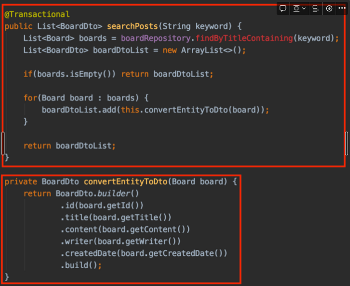 repository를 이용하여 title에 keyword 값이 포함된 데이터만 가져온다. findByTitleContaining은 repository에 선언해줘야한다. BoardDto에 데이터를 매핑하여 리턴한다.