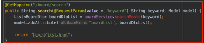 @RequestParam 요청으로 들어온 값 중 ‘keyword’로 넘어온 값을 받아서 해당 키워드가 포함된 리스트를 넘겨주는 search를 사용하고 model을 통해 view에 값을 넘겨준다.