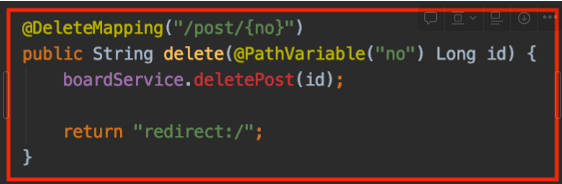 deletePost를 사용해서 게시글 id로 DB에서 게시글을 삭제. 실제 구현은 Service에서 함