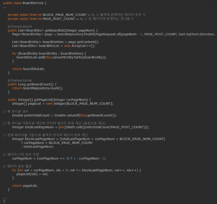 - getPageList() 메서드도 신규로 추가한 메서드이며, 프론트에 노출시킬 페이지 번호 리스트를 계산하는 로직