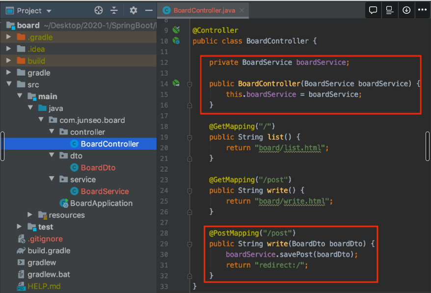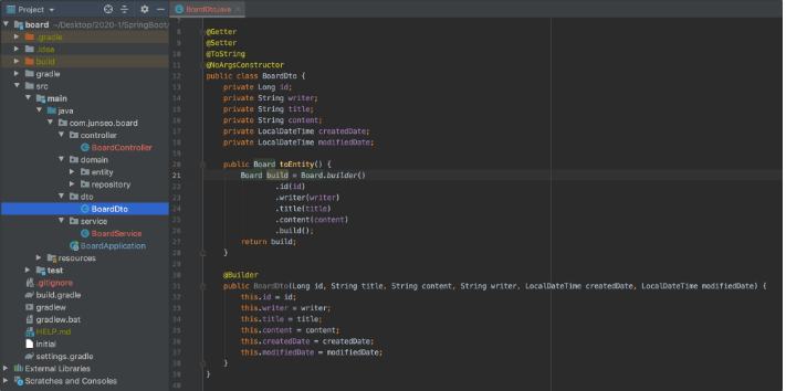 BoardDto를 이용해 DB에 저장된 데이터를 List로 불러올 것이다. 실제 로직은 Service에서 구현