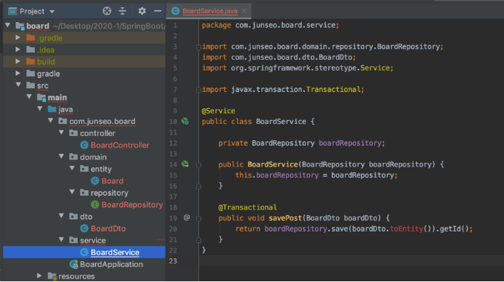 만들어준 repository를 이용하여, service를 구현해보자. Service는 실제 비즈니스 로직을 시행해주는 역할