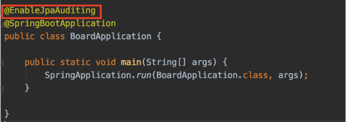 JPA Audting 기능을 사용하기 위해 main 클래스에 @EnableJpaAudting 애노테이션을 붙여준다.